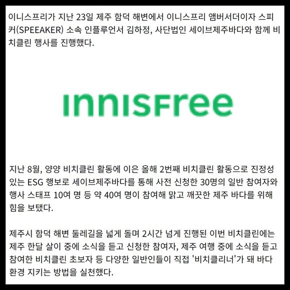[프라임경제] 이니스프리가 지난 23일 제주 함덕 해변에서 이니스프리 앰버서더이자 스피커(SPEEAKER) 소속 인플루언서 김하정, 사단법인 세이브제주바다와 함께 비치클린 행사를 진행했다.