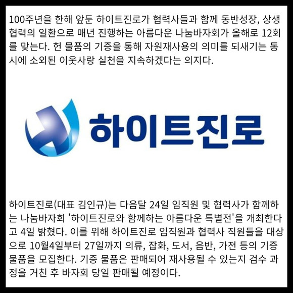 [카드] 하이트진로, 나눔바자회 '아름다운하루 특별전' 기증 물품 모집