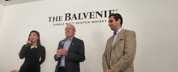 (왼쪽부터) 발베니 몰트 마스터 켈시 멕케크니, 발베니 전 몰트 마스터 데이비드 스튜어트, 글로벌 앰버서더 찰리. = 추민선 기자