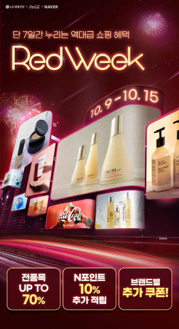 'LG생활건강샵' 등 네이버쇼핑 내 각종 LG생활건강 공식·직영몰에서 열린 이번 레드위크 행사에는 LG생활건강의 뷰티, 생활용품, 음료 브랜드 대다수가 함께 참가해서 고객에게 할인 혜택과 이벤트 등 다양한 고객경험을 제공한다.