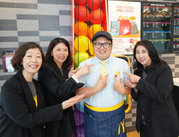 지난 6일 '창립자의 날'을 맞아 천안두정역DT점을 방문한 한국맥도날드 김기원 대표, 정승혜 부사장, 한연미 부사장이 천안두정역DT점 신효석 크루와 기념사진 촬영을 하고 있다. (왼쪽부터) 한국맥도날드 정승혜 부사장, 김기원 대표, 신효석 크루, 한연미 부사장. © 한국맥도날드