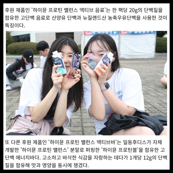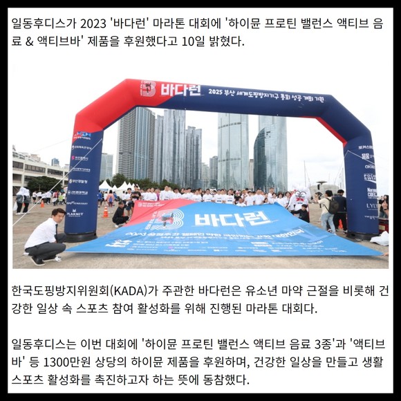 [프라임경제] 일동후디스가 2023 '바다런' 마라톤 대회에 '하이뮨 프로틴 밸런스 액티브 음료 & 액티브바' 제품을 후원했다고 10일 밝혔다.