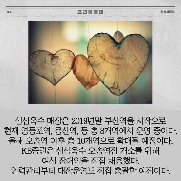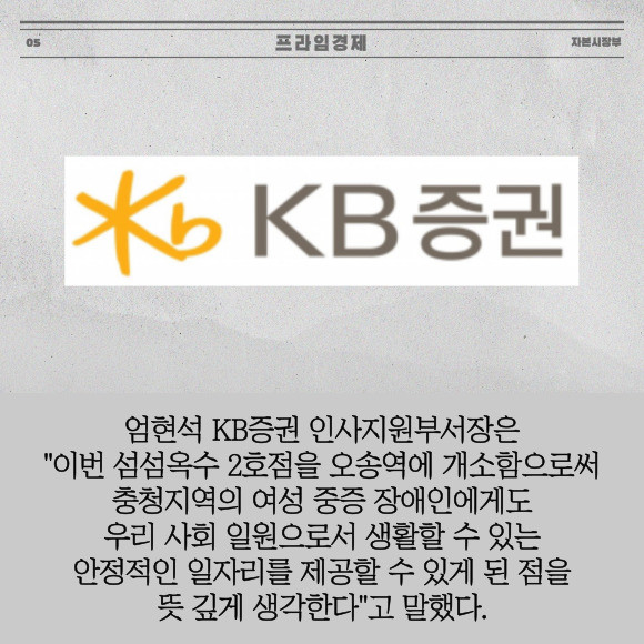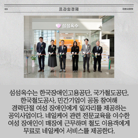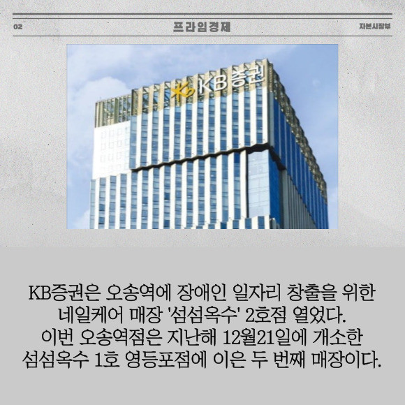 [프라임경제] KB증권은 지난 5일 오송역에 장애인 일자리 창출을 위한 네일케어 매장 '섬섬옥수' 2호점 열었다고 10일 밝혔다. 이번 오송역점은 지난해 12월21일에 개소한 섬섬옥수 1호 영등포점에 이은 두 번째 매장이다.