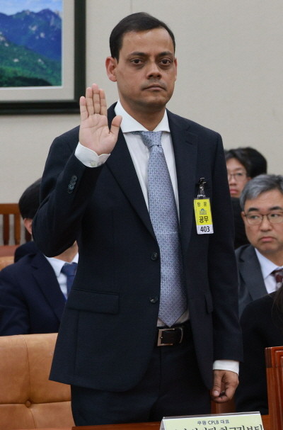 11일 국회에서 열린 환경노동위원회 국정감사에서 산디판 파크라보티 쿠팡 CLB대표가 증인 선서를 하고 있다. © 연합뉴스