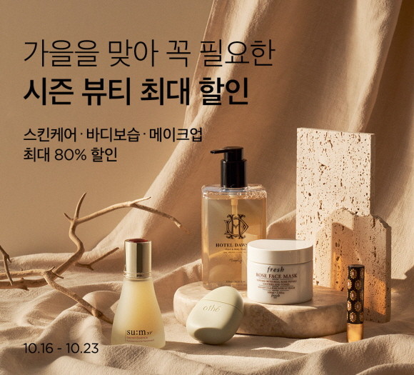 이번 행사에서는 스킨케어부터 메이크업, 향수에 이르기까지 가을 뷰티에 꼭 필요한 3000여 개 상품을 엄선해 선보인다. 럭셔리와 인디 브랜드의 제품을 다양하게 큐레이션해 선택의 폭을 넓혔다. 특히 환절기 보습 고민이 많은 이들을 위해 1+1 스킨케어, 대용량 바디 및 헤어케어 제품도 준비했다. 일일특가, 페스타딜 등 할인 혜택 또한 풍성하게 마련해 가격 부담을 낮췄다.
