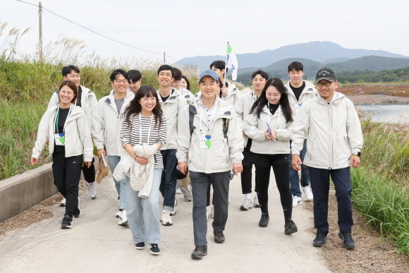 삼양홀딩스 김윤 회장이 임직원들과 해리염전 둘레길 트레킹을 하고 있다. © 삼양홀딩스