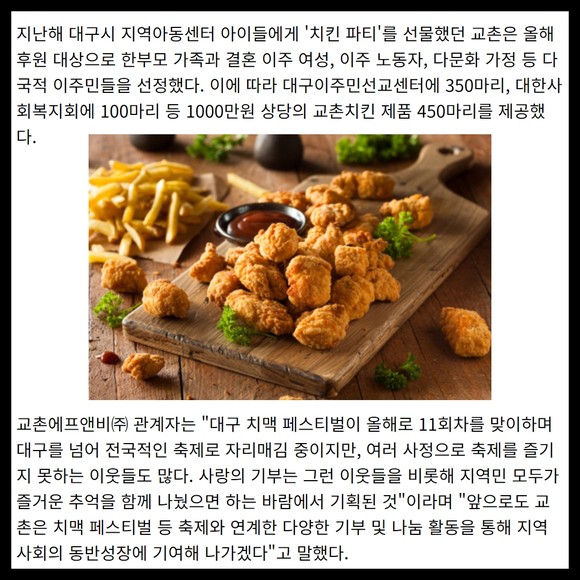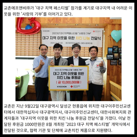 [프라임경제] 교촌에프앤비㈜가 '대구 치맥 페스티벌' 참가를 계기로 대구지역 내 어려운 이웃을 위한 '사랑의 기부'를 이어가고 있다.