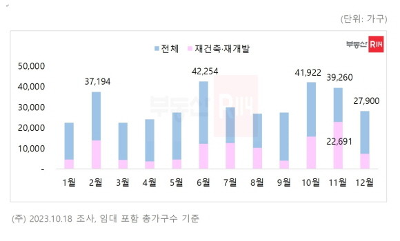 2023년 월별 전국 아파트 입주 및 입주예정 물량. © 부동산R114 REPS