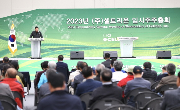 셀트리온그룹은 23일 인천 송도 컨벤시아와 쉐라톤 그랜드 인천호텔에서 각각 진행된 셀트리온과 셀트리온헬스케어 임시 주주총회에서 양사의 합병 안건이 모두 가결됐다고 밝혔다. 이날 임시주총에서 인사말하는 서정진 셀트리온 회장. © 연합뉴스