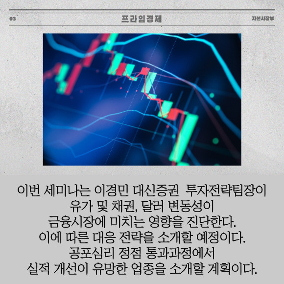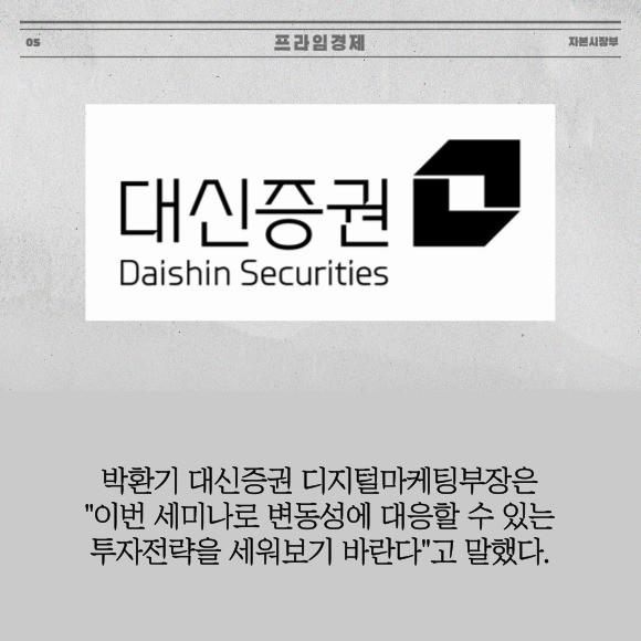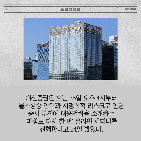 [프라임경제] 대신증권(003540)은 오는 25일 오후 4시부터 물가상승 압력과 지정학적 리스크로 인한 증시 부진에 대응전략을 소개하는 '미워도 다시 한 번' 온라인 세미나를 진행한다고 24일 밝혔다.