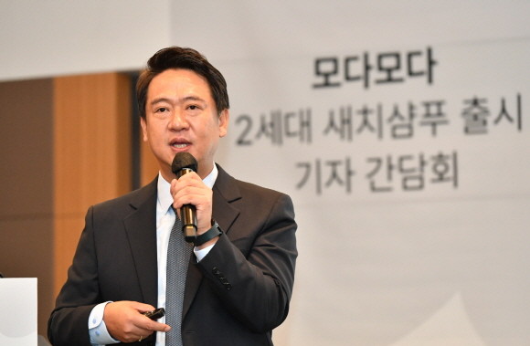 모다모다가 26일 서울 강남구 인터컨티넨탈 호텔에서 기자간담회를 개최하고, 2세대 새치 샴푸 '모다모다 제로 그레이 블랙 샴푸' 출시와 함께 글로벌 라이프스타일 그룹으로서 새 비전을 발표했다. 사진은 배형진 모다모다 대표가 발표를 진행하고 있는 모습. © 모다모다