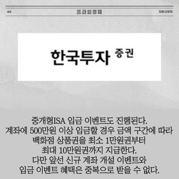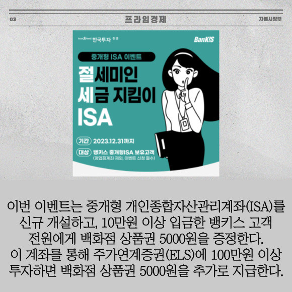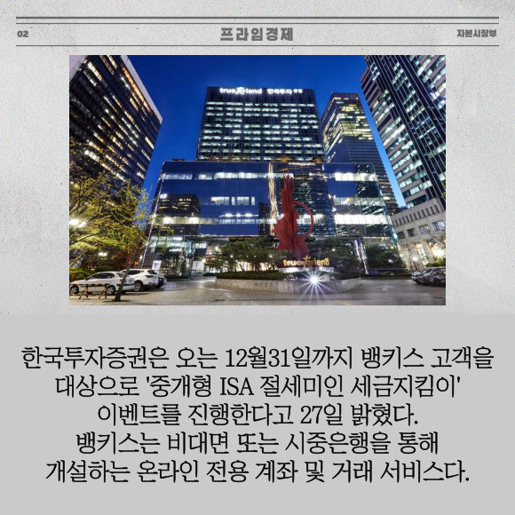 [프라임경제] 한국투자증권은 오는 12월31일까지 뱅키스 고객을 대상으로 '중개형 ISA 절세미인 세금지킴이' 이벤트를 진행한다고 27일 밝혔다. 뱅키스는 비대면 또는 시중은행을 통해 개설하는 온라인 전용 계좌 및 거래 서비스다.