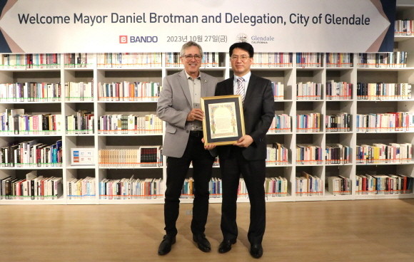 美 글렌데일시 댄 브로트만 시장(사진 가운데)이 동탄2신도시 반도문화재단을 방문해 송한규 반도건설 상무에게 그 동안의 협력 도모에 대한 감사의 뜻으로 감사패를 전달했다. Ⓒ 반도건설