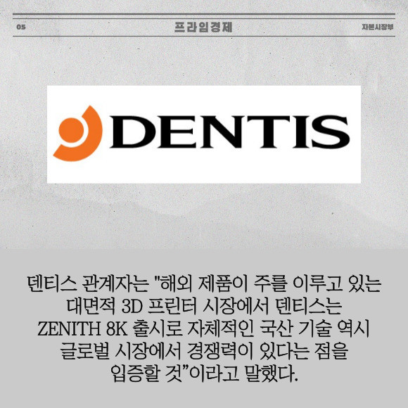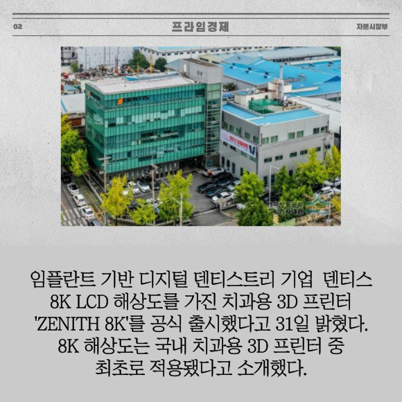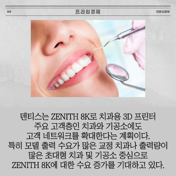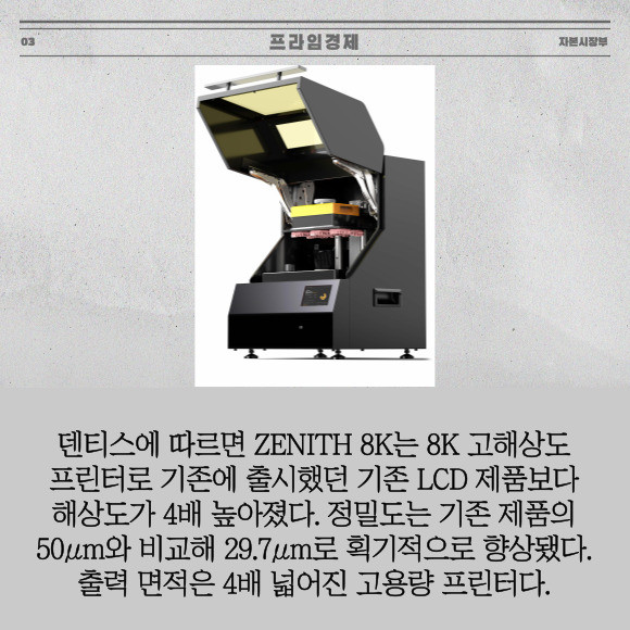 [프라임경제] 임플란트 기반 디지털 덴티스트리 기업 덴티스(261200)는 8K LCD 해상도를 가진 치과용 3D 프린터 'ZENITH 8K'를 공식 출시했다고 31일 밝혔다. 8K 해상도는 국내 치과용 3D 프린터 중 최초로 적용됐다고 소개했다.