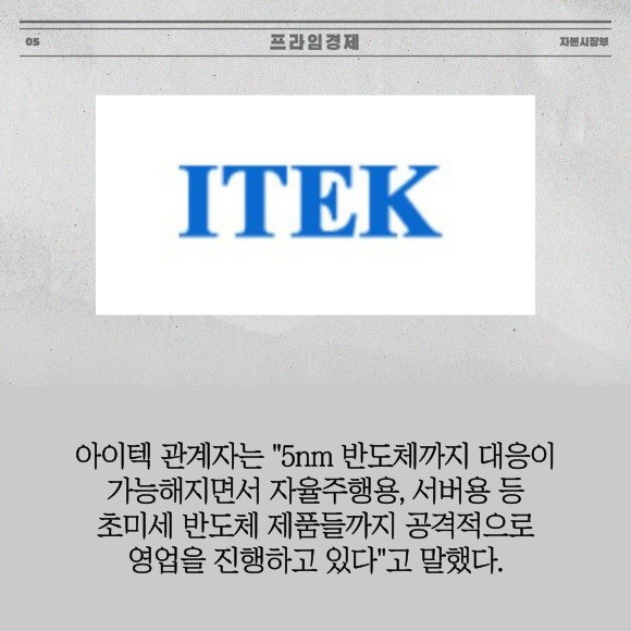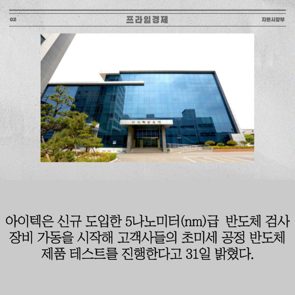 [프라임경제] 아이텍(119830)은 신규 도입한 5나노미터(nm)급 반도체 검사장비 가동을 시작해 고객사들의 초미세 공정 반도체 제품 테스트를 진행한다고 31일 밝혔다.