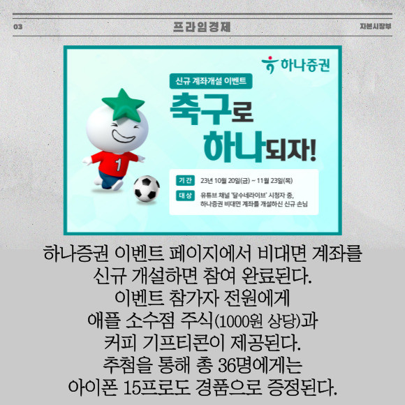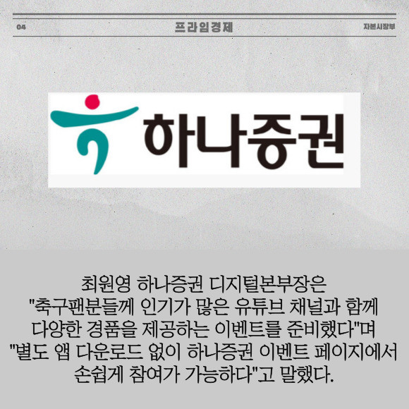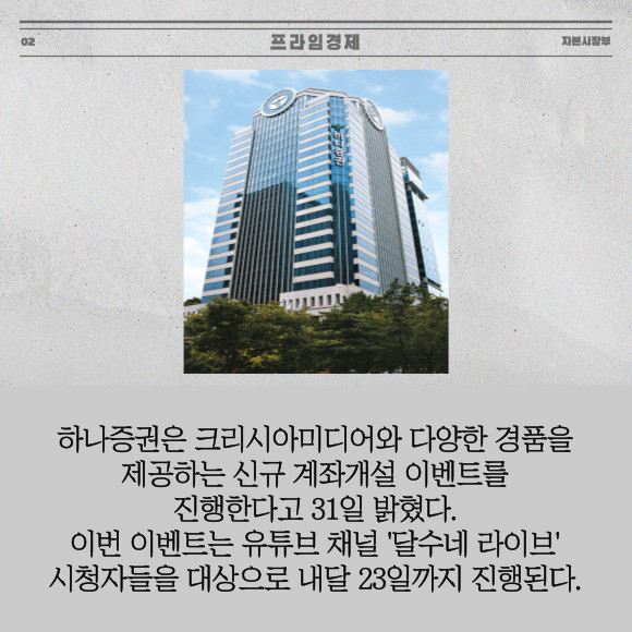 [프라임경제] 하나증권은 크리시아미디어와 다양한 경품을 제공하는 신규 계좌개설 이벤트를 진행한다고 31일 밝혔다. 이번 이벤트는 유튜브 채널 '달수네 라이브' 시청자들을 대상으로 내달 23일까지 진행된다.