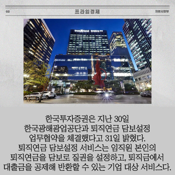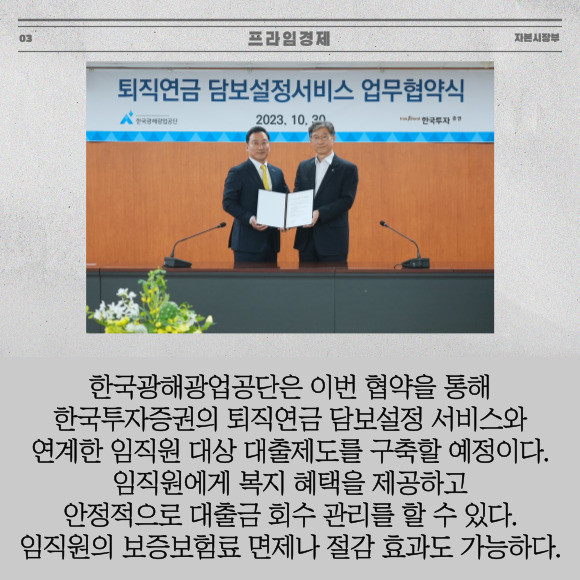 [프라임경제] 한국투자증권은 지난 30일 한국광해광업공단과 퇴직연금 담보설정 업무협약을 체결했다고 31일 밝혔다.