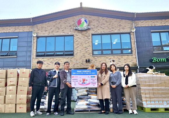 31일 오전 경기도 파주 한국유기동물복지협회에서 김미숙 현대홈쇼핑 팀장(왼쪽에서 네 번째), 임장춘 한국유기동물복지협회장(왼쪽에서 세 번째) 등 관계자들이 사료 전달식을 가진 뒤 기념촬영을 하고 있다. © 현대홈쇼핑