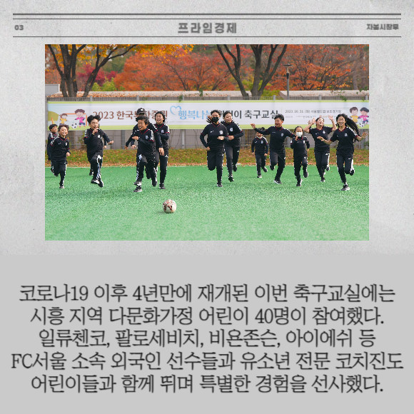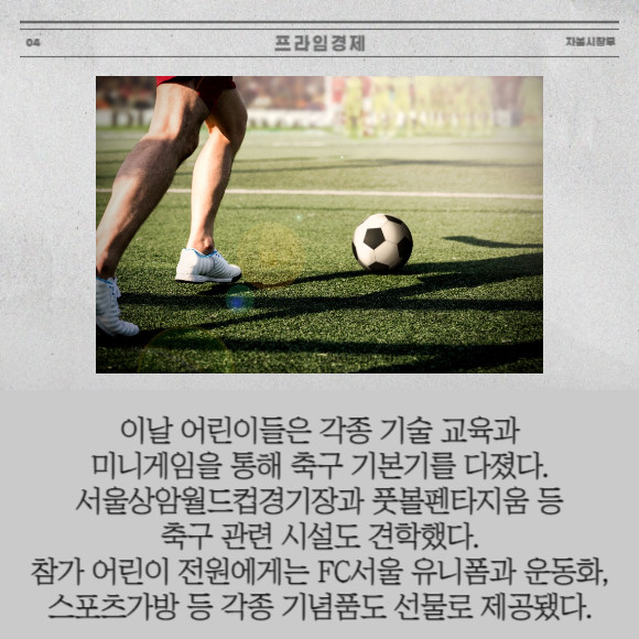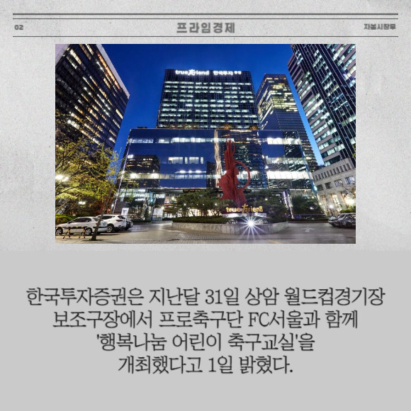[프라임경제] 한국투자증권은 지난달 31일 상암 월드컵경기장 보조구장에서 프로축구단 FC서울과 함께 '행복나눔 어린이 축구교실'을 개최했다고 1일 밝혔다.