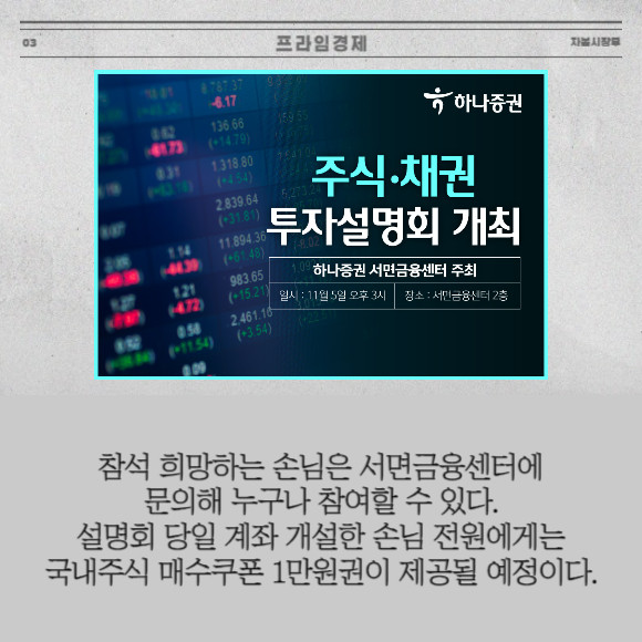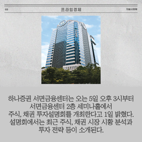 [프라임경제] 하나증권 서면금융센터는 오는 5일 오후 3시부터 서면금융센터 2층 세미나홀에서 주식, 채권 투자설명회를 개최한다고 1일 밝혔다. 설명회에서는 최근 주식, 채권 시장 시황 분석과 투자 전략 등이 소개된다.