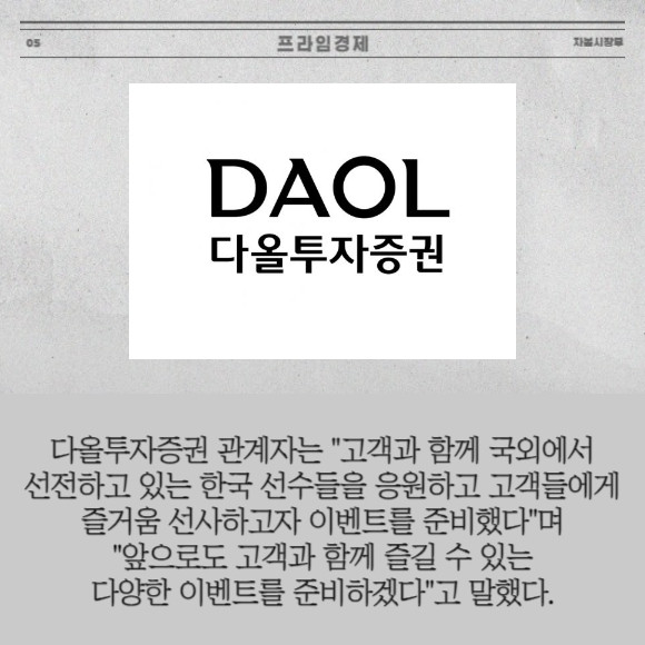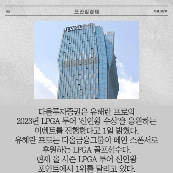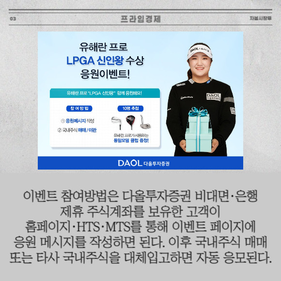 [프라임경제] 다올투자증권(030210)은 유해란 프로의 2023년 LPGA 투어 '신인왕 수상'을 응원하는 이벤트를 진행한다고 1일 밝혔다. 유해란 프로는 다올금융그룹이 메인 스폰서로 후원하는 LPGA 골프선수다. 현재 올 시즌 LPGA 투어 신인왕 포인트에서 1위를 달리고 있다.