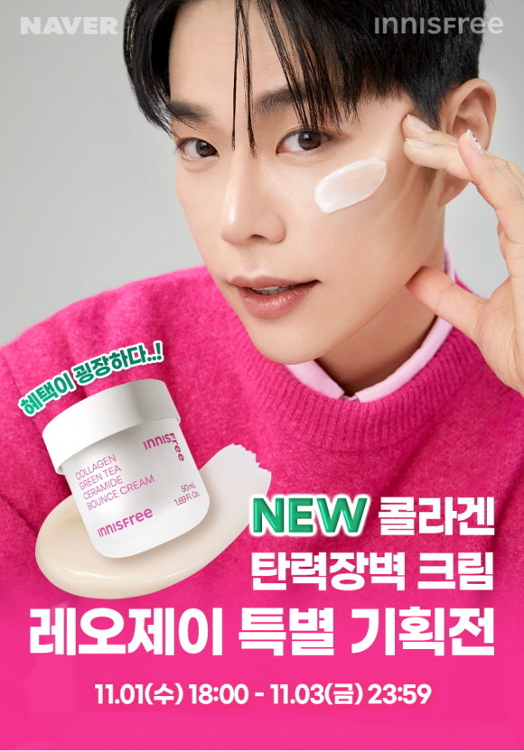 이니스프리가 11월1일 오후 6시 라이브 방송을 시작으로 3일까지 총 3일간 119만 뷰티 크리에이터 레오제이와 '콜라겐 그린티 세라마이드 탄력장벽 크림 기획전'을 진행한다.