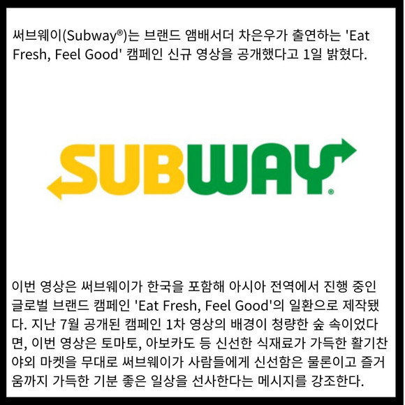 [카드] 써브웨이, 차은우 출연 'Eat Fresh, Feel Good' 캠페인 신규 영상 공개
