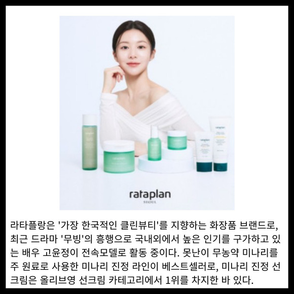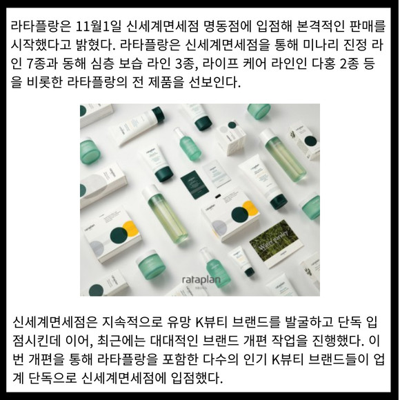 [프라임경제] 라타플랑은 11월1일 신세계면세점 명동점에 입점해 본격적인 판매를 시작했다고 밝혔다. 라타플랑은 신세계면세점을 통해 미나리 진정 라인 7종과 동해 심층 보습 라인 3종, 라이프 케어 라인인 다홍 2종 등을 비롯한 라타플랑의 전 제품을 선보인다.