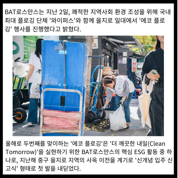 [프라임경제] BAT로스만스는 지난 2일, 쾌적한 지역사회 환경 조성을 위해 국내 최대 플로깅 단체 '와이퍼스'와 함께 을지로 일대에서 '에코 플로깅' 행사를 진행했다고 밝혔다.