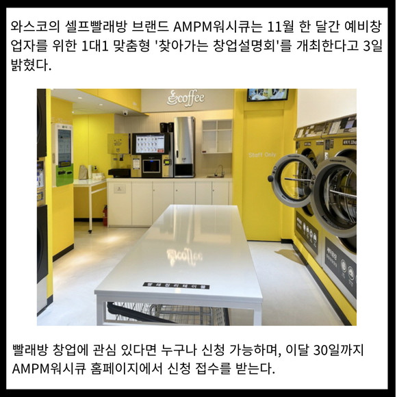 [프라임경제] 와스코의 셀프빨래방 브랜드 AMPM워시큐는 11월 한 달간 예비창업자를 위한 1대1 맞춤형 '찾아가는 창업설명회'를 개최한다고 3일 밝혔다.