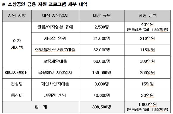 이자 캐시백은 △원리금 상환유예 대출자(2500명) △제조업 자영업자(2만1000명) △희망플러스 보증부대출 이용자(3만2000명) △지역신용보증재단 보증서 신규 대출자(6만명)이 대상이다. 약 665억원이 해당 대출자들에게 돌아가게 된다.