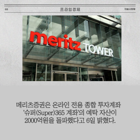 [프라임경제] 메리츠증권은 온라인 전용 종합 투자계좌 '슈퍼(Super)365 계좌'의 예탁 자산이 2000억원을 돌파했다고 6일 밝혔다.