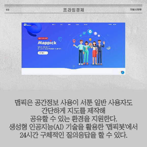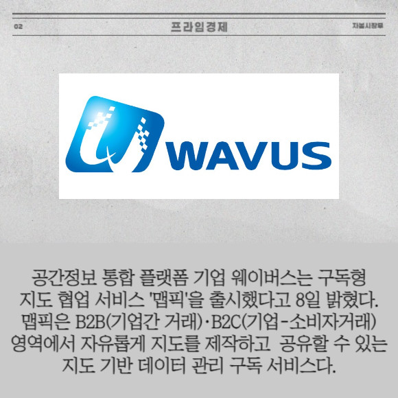 [프라임경제] 공간정보 통합 플랫폼 기업 웨이버스(336060)는 구독형 지도 협업 서비스 '맵픽'을 출시했다고 8일 밝혔다. 맵픽은 B2B(기업간 거래)·B2C(기업-소비자거래) 영역에서 자유롭게 지도를 제작하고 공유할 수 있는 지도 기반 데이터 관리 구독 서비스다.