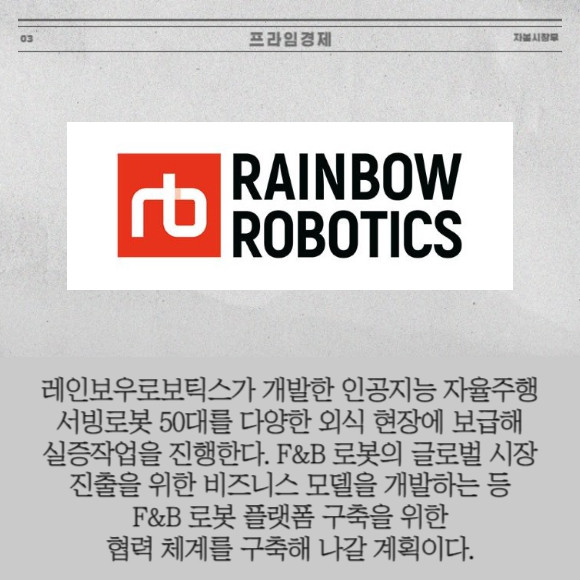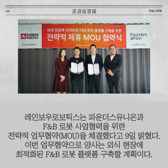 [카드] 레인보우로보틱스·파운더스유니온, F&B 로봇 '맞손'
