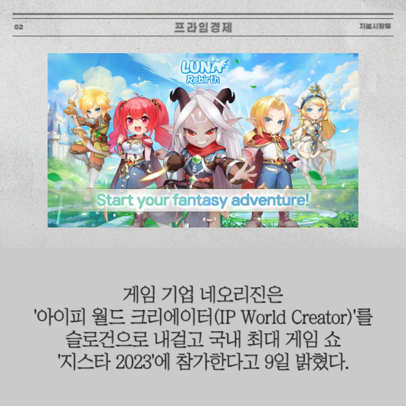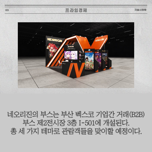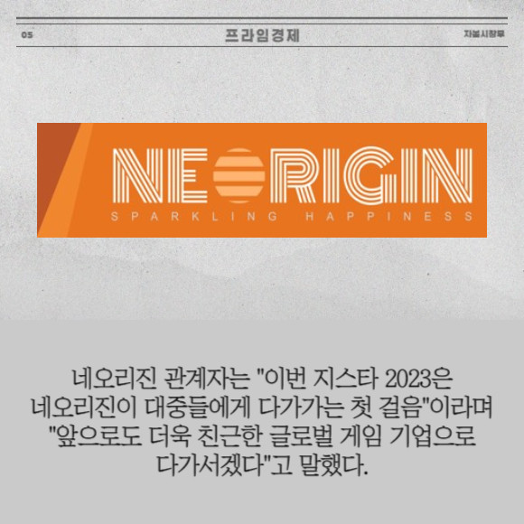 [프라임경제] 게임 기업 네오리진(094860)은 '아이피 월드 크리에이터(IP World Creator)'를 슬로건으로 내걸고 국내 최대 게임 쇼 '지스타 2023'에 참가한다고 9일 밝혔다.