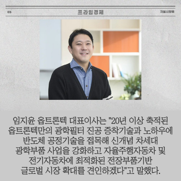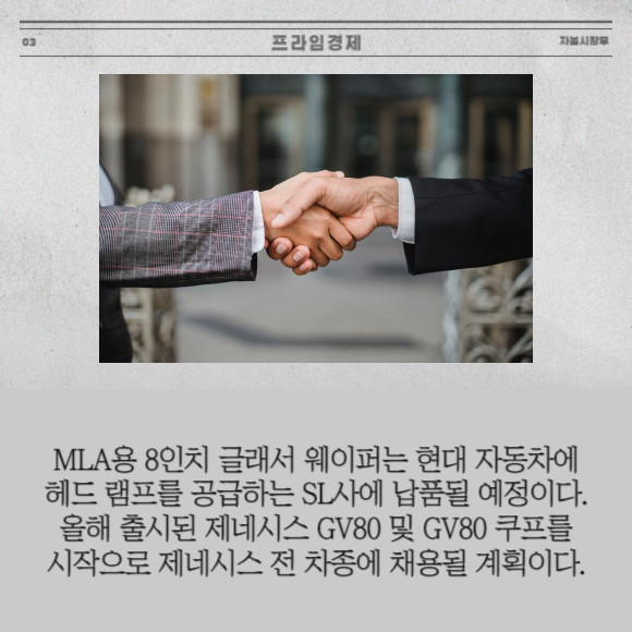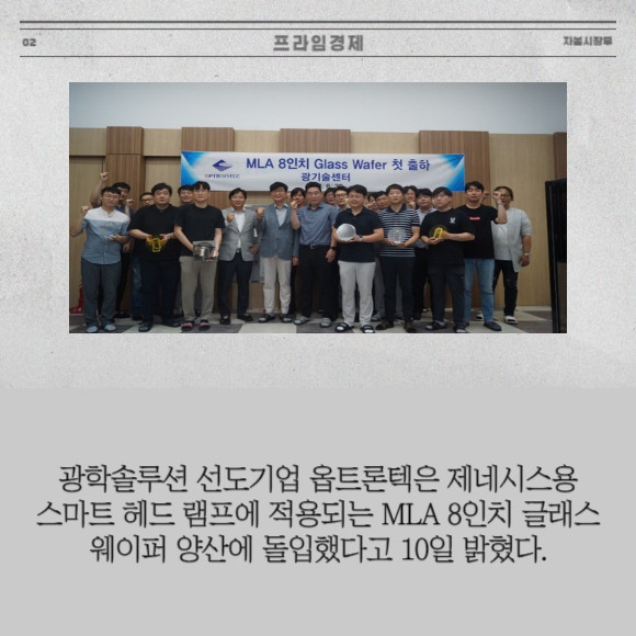 [프라임경제] 광학솔루션 선도기업 옵트론텍(082210)은 제네시스용 스마트 헤드 램프에 적용되는 MLA 8인치 글래스 웨이퍼 양산에 돌입했다고 10일 밝혔다.