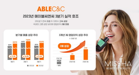 에이블씨엔씨는 올해 3분기 연결기준 영업이익이 지난해 같은 기간 대비 126% 늘어난 13억원을 기록했다고 공시했다. 6억원이었던 전년 동기 대비 2배 이상 증가한 수치다. 같은 기간 연결기준 매출은 653억원, 상각 전 영업이익(EBITDA)은 41억원으로 전년동기 대비 각각 11.4%, 35.1% 늘어나며 올해 3개 분기 연속 흑자 및 두 자릿수 매출 성장을 이어갔다.