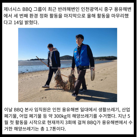[프라임경제] 제너시스 BBQ 그룹이 최근 반려해변인 인천광역시 중구 용유해변에서 세 번째 환경 정화 활동을 마지막으로 올해 활동을 마무리했다고 14일 밝혔다.