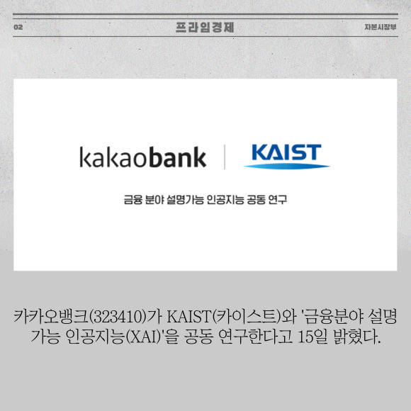 [프라임경제] 카카오뱅크(323410)가 KAIST(카이스트)와 '금융분야 설명가능 인공지능(XAI)'을 공동 연구한다고 15일 밝혔다.