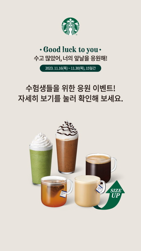 스타벅스 매장에서는 '2024학년도 대입수학능력시험 수험표'를 보여주며 대상 음료 5종을 주문 시 무료로 한 사이즈 업그레이드해 제공한다. 무료 사이즈 업그레이드 혜택은 수험표 확인을 위해 현장 주문을 통해서만 가능하다.