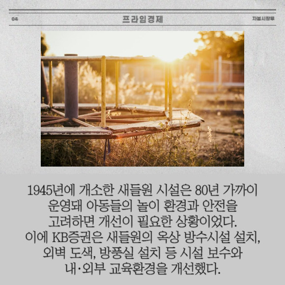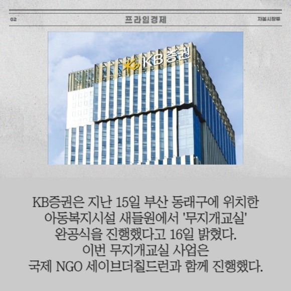 [프라임경제] KB증권은 지난 15일 부산 동래구에 위치한 아동복지시설 새들원에서 '무지개교실' 완공식을 진행했다고 16일 밝혔다. 이번 무지개교실 사업은 국제 NGO 세이브더칠드런과 함께 진행했다.