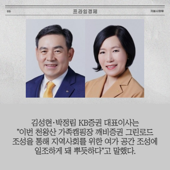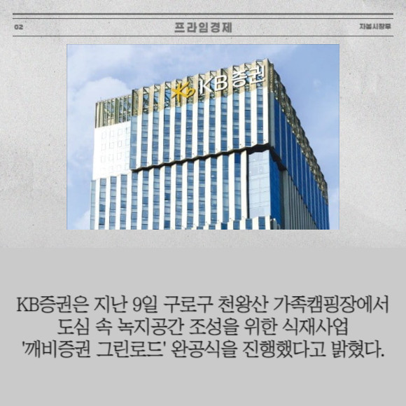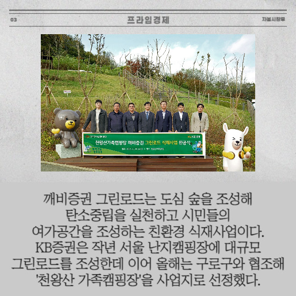 [프라임경제] KB증권은 지난 9일 구로구 천왕산 가족캠핑장에서 도심 속 녹지공간 조성을 위한 식재사업 '깨비증권 그린로드' 완공식을 진행했다고 17일 밝혔다.
