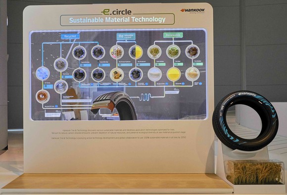또 한국타이어의 '2050 탄소중립 로드맵' 실현을 위한 친환경 상품 개발 내용도 행사에서 설명했다. 한국타이어는 전기차 전용 타이어 브랜드 아이온(iON) 제품에 지속가능한 원료를 확대 적용하고, 친환경 순환 경제 체제 구축 전략 E.서클(E.Circle)을 기반으로 △재활용(Recycle) △재생(Renewable) △재사용(Reuse) △감소(Reduce) 4가지 원칙을 적용한 친환경 상품 개발을 진행 중에 있다.
