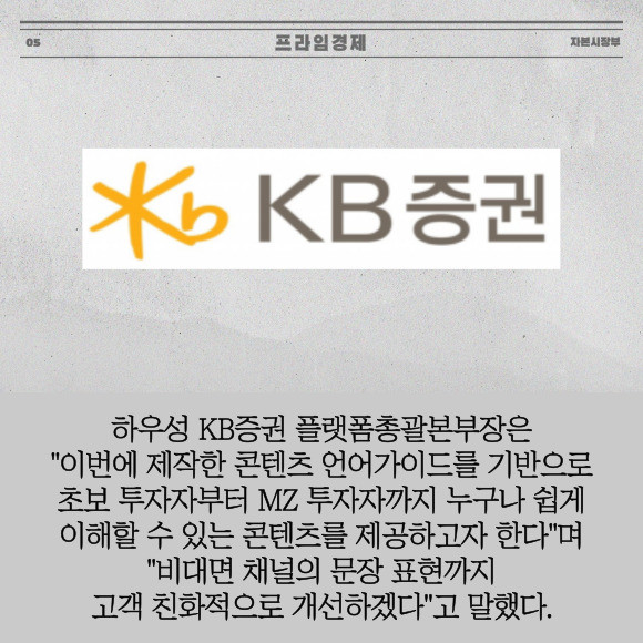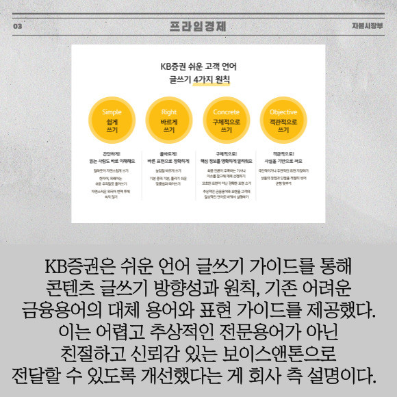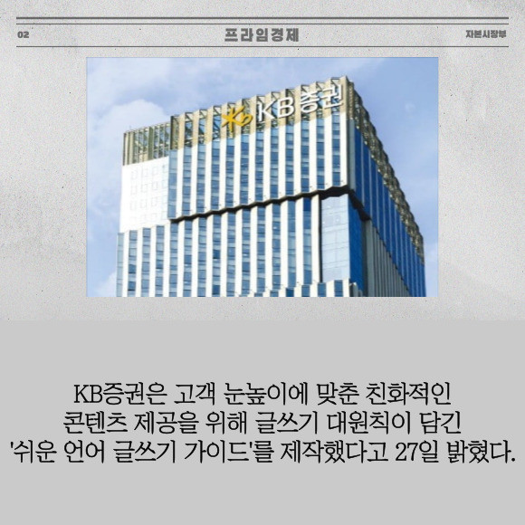 [프라임경제] KB증권은 고객 눈높이에 맞춘 친화적인 콘텐츠 제공을 위해 글쓰기 대원칙이 담긴 '쉬운 언어 글쓰기 가이드'를 제작했다고 27일 밝혔다.