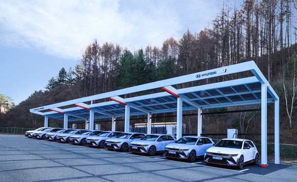 인제 스피디움에 개소된 N 브랜드 특화 급속충전소에서 아이오닉 5 N 차량들이 충전하고 있는 모습. ⓒ 현대자동차
