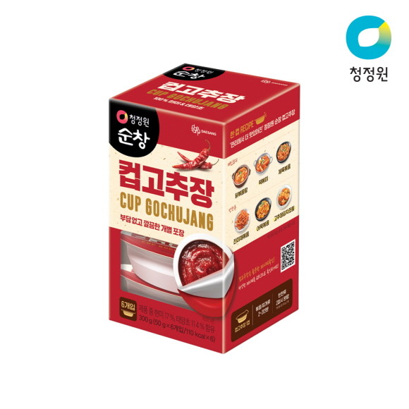 '순창 컵고추장' 패키지는 50g짜리 컵 6개로 구성돼 있으며, 겉면의 QR코드를 찍으면 컵고추장을 활용한 다양한 레시피를 확인할 수 있다.