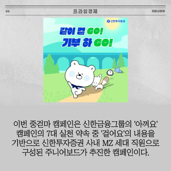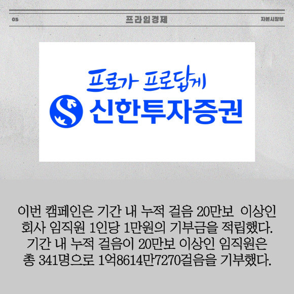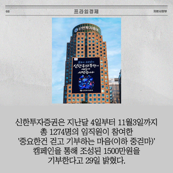[프라임경제] 신한투자증권은 지난달 4일부터 11월3일까지 총 1274명의 임직원이 참여한 '중요한건 걷고 기부하는 마음(이하 중걷마)' 캠페인을 통해 조성된 1500만원을 기부한다고 29일 밝혔다.