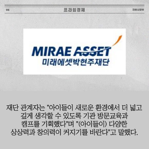 [프라임경제] 미래에셋박현주재단은 지난 25일 초등학생 80여명과 함께 '미래에셋 청소년 비전프로젝트 캠프'를 실시했다고 30일 밝혔다. 청소년 비전프로젝트의 올해 주제는 '코딩'이다.