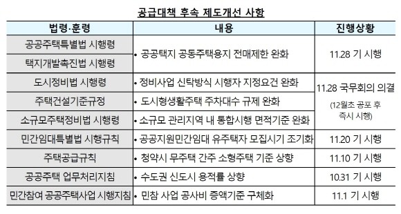 한편, 주택공급 활성화 방안에 따른 제도개선(9개 법령‧훈령)도 모두 완료됐다. 더불어 △청약시 무주택 간주 주택 기준 상향(11월10일 시행) △공공택지 전매제한 완화(11월28일 시행) △도시형 생활주택 주차대수 규제 완화(12월초 시행 예정) 등도 시행됨에 따라 민간 주택공급 여건도 개선될 전망이다.