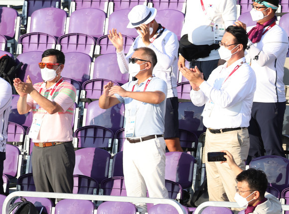 정의선 현대차그룹 회장이 지난 도쿄올림픽 여자 양궁 단체전에서 양궁 여자 대표팀이 금메달을 획득하자 박수를 치고 있다. ⓒ 연합뉴스